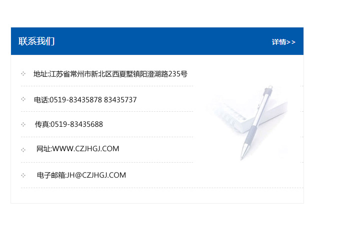 傳真:0519-83435688    郵編:213135    網址:WWW.czjhgj_com.xchtsp.com    電子郵箱:JH@czjhgj_com.xchtsp.com